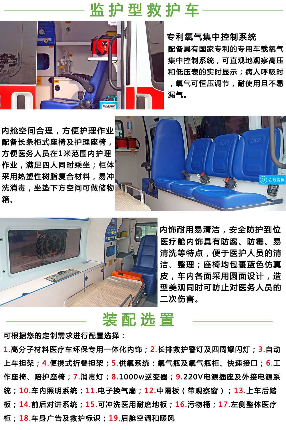 備注 | 選裝車頂、盲窗、雙側(cè)移門、推拉側(cè)車窗、鋼輪圈、側(cè)爆閃燈、后爆閃燈、換氣扇、側(cè)踏步、牌照裝飾板、后踏步、天窗、不鍍鉻水箱面罩、全鍍鉻水箱面罩、前圍、后軸空氣懸掛系統(tǒng)。不裝后踏步車長4950mm,后懸985mm,離去角17°。選裝低頂車高2300mm,選裝中頂車高2510mm,選裝異型頂車高2435mm。該車型可以不裝前霧燈,不裝高位制動(dòng)燈。車輛外部標(biāo)識(shí)及字樣可按行業(yè)或用戶要求噴涂或粘貼。專用裝置描述:**示燈**報(bào)系統(tǒng),自動(dòng)上車擔(dān)架,醫(yī)療器械柜。專用功能:院前急救和轉(zhuǎn)運(yùn)。ABS生產(chǎn)廠:博世汽車部件(蘇州)有限公司。ABS型號:ABS9.0,ESP9。發(fā)動(dòng)機(jī)**大凈功率:97.5kw。 |